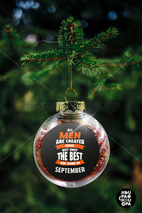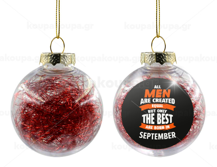 All men are created equal but only the best are born in September, Στολίδι Χριστουγεννιάτικη μπάλα δένδρου διάφανη με κόκκινο γέμισμα 8cm