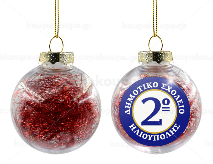 Έμβλημα Σχολικό μπλε/χρυσό, Στολίδι Χριστουγεννιάτικη μπάλα δένδρου διάφανη με κόκκινο γέμισμα 8cm