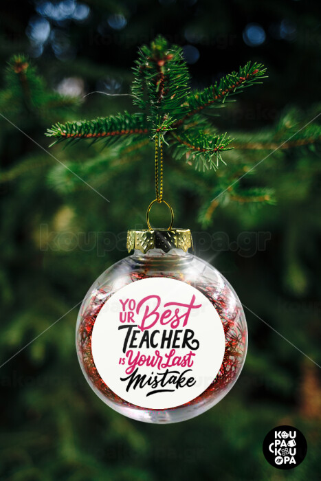 Typography quotes your best teacher is your last mistake, Στολίδι Χριστουγεννιάτικη μπάλα δένδρου διάφανη με κόκκινο γέμισμα 8cm