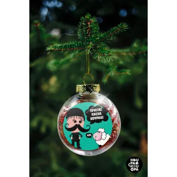 Κρητικός "Έρχεται Πάσχα κουράδι", Στολίδι Χριστουγεννιάτικη μπάλα δένδρου διάφανη με κόκκινο γέμισμα 8cm