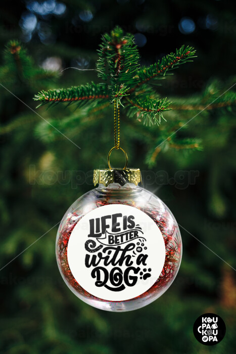 Life is better with a DOG, Στολίδι Χριστουγεννιάτικη μπάλα δένδρου διάφανη με κόκκινο γέμισμα 8cm