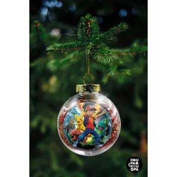 Ash Ketchum & Pikachu, Στολίδι Χριστουγεννιάτικη μπάλα δένδρου διάφανη με κόκκινο γέμισμα 8cm