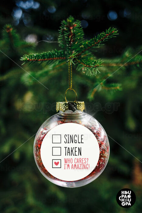 Single, Taken, Who cares i'm amazing, Στολίδι Χριστουγεννιάτικη μπάλα δένδρου διάφανη με κόκκινο γέμισμα 8cm