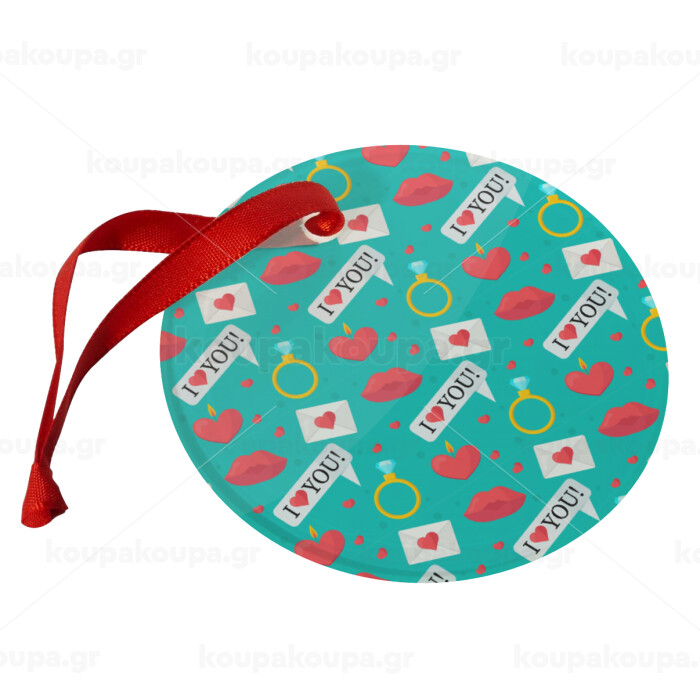 I Love You hearts rings & kiss pattern, Στολίδι Χριστουγεννιάτικο στολίδι γυάλινο 9cm