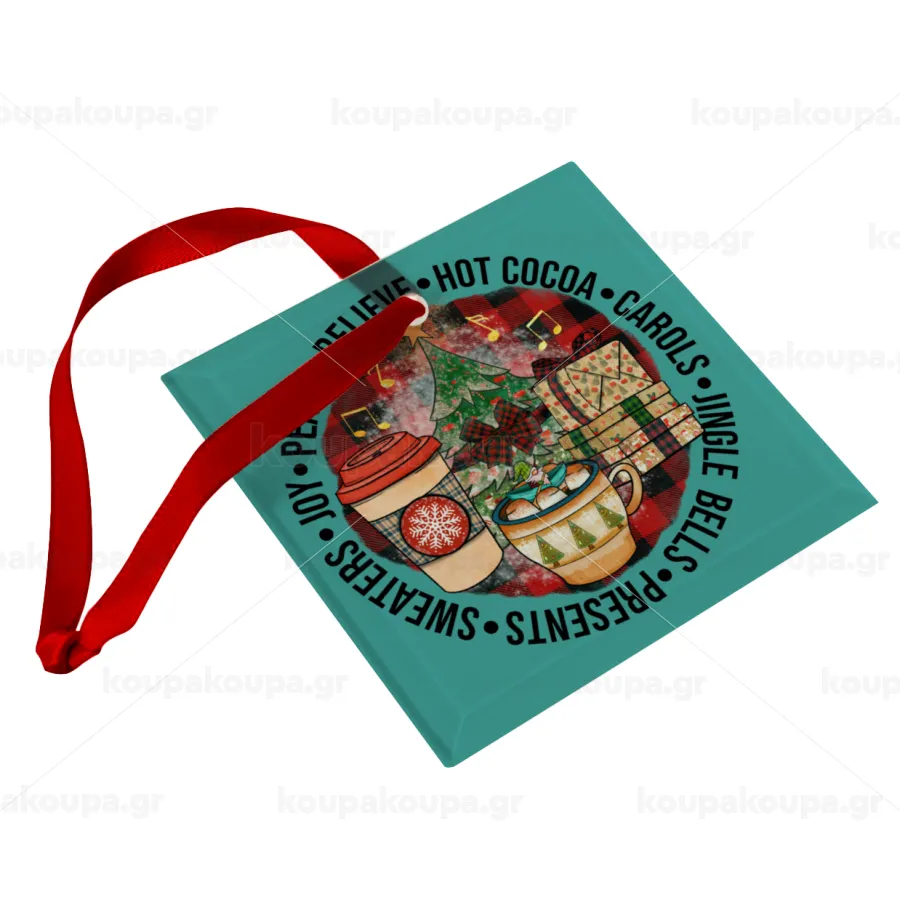 Joy, Peace, Believe, Hot Cocoa, Carols, Στολίδι Χριστουγεννιάτικο στολίδι γυάλινο τετράγωνο 9x9cm
