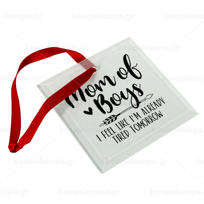 Mom of boys i feel like im already tired tomorrow, Στολίδι Χριστουγεννιάτικο στολίδι γυάλινο τετράγωνο 9x9cm