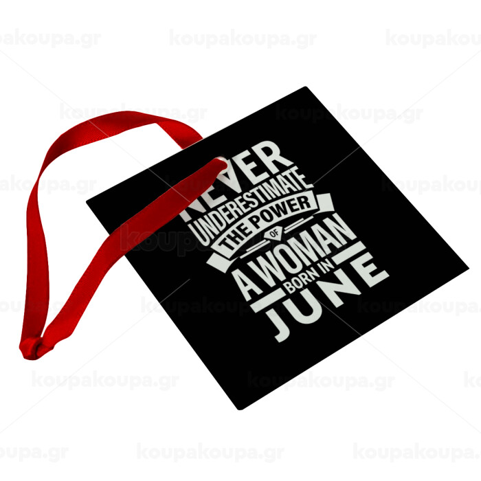 Never Underestimate the poer of a Woman born in..., Στολίδι Χριστουγεννιάτικο στολίδι γυάλινο τετράγωνο 9x9cm
