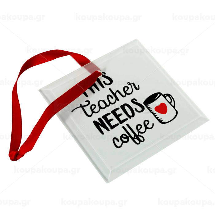 Τhis teacher needs coffee, Στολίδι Χριστουγεννιάτικο στολίδι γυάλινο τετράγωνο 9x9cm