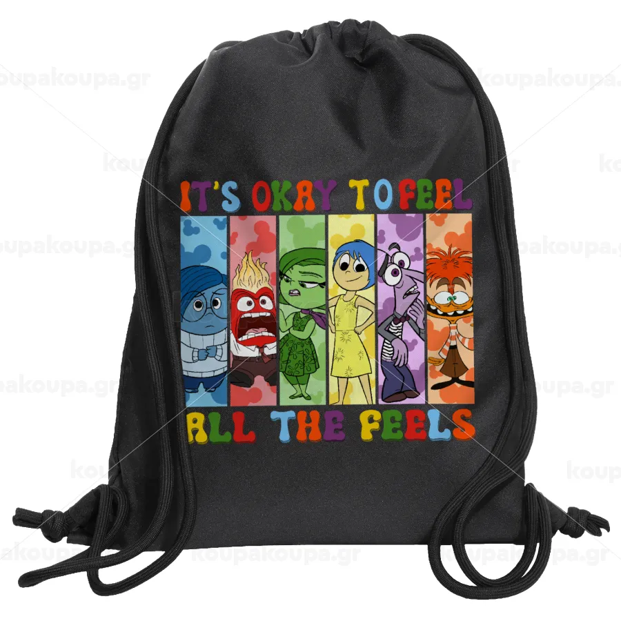 Inside Out It's Okay To Feel All The Feels , Backpack pouch GYMBAG Black, with pocket (40x48cm) & thick cords