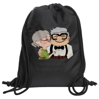 UP, YOU WILL ALWAYS BE MY GREATEST ADVENTURE, Backpack pouch GYMBAG Black, with pocket (40x48cm) & thick cords