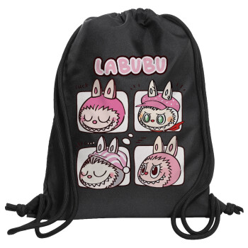 Labubu pink, Backpack pouch GYMBAG Black, with pocket (40x48cm) & thick cords