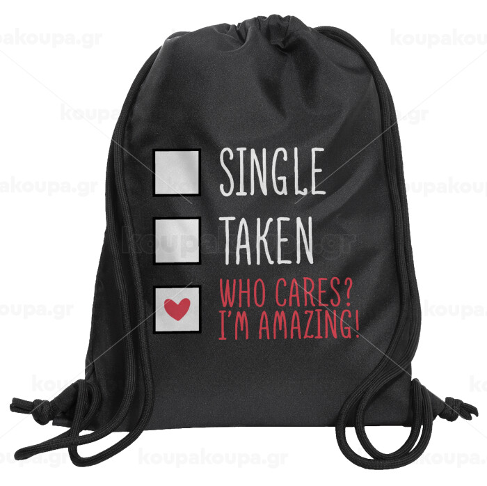 Single, Taken, Who cares i'm amazing, Backpack pouch GYMBAG Black, with pocket (40x48cm) & thick cords