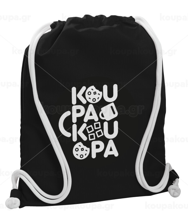 koupakoupa, Backpack pouch GYMBAG Black, with pocket (40x48cm) & thick white cords