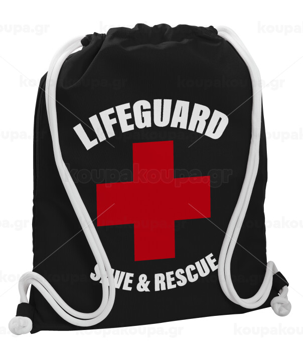 Lifeguard Save & Rescue, Backpack pouch GYMBAG Black, with pocket (40x48cm) & thick white cords