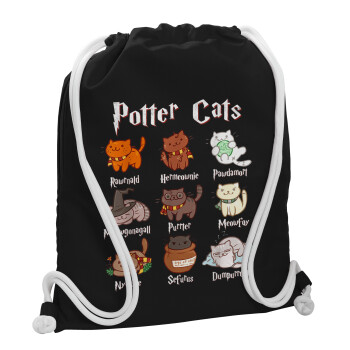 Potter Cats, Backpack pouch GYMBAG Black, with pocket (40x48cm) & thick white cords