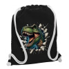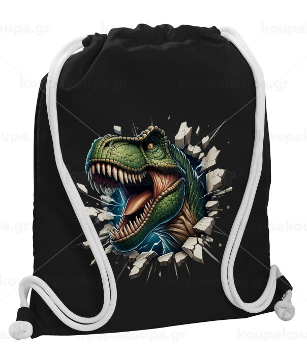 Dinosaur break wall, Backpack pouch GYMBAG Black, with pocket (40x48cm) & thick white cords