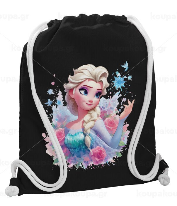 Elsa Princess, Backpack pouch GYMBAG Black, with pocket (40x48cm) & thick white cords