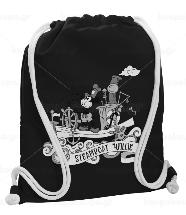 Mickey steamboat, Backpack pouch GYMBAG Black, with pocket (40x48cm) & thick white cords