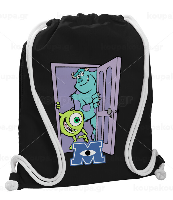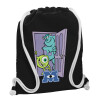 Monster inc, Backpack pouch GYMBAG Black, with pocket (40x48cm) & thick white cords