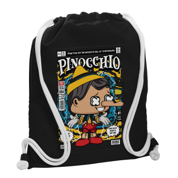 Pinocchio, Backpack pouch GYMBAG Black, with pocket (40x48cm) & thick white cords