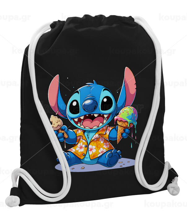 Stitch Ice cream, Backpack pouch GYMBAG Black, with pocket (40x48cm) & thick white cords