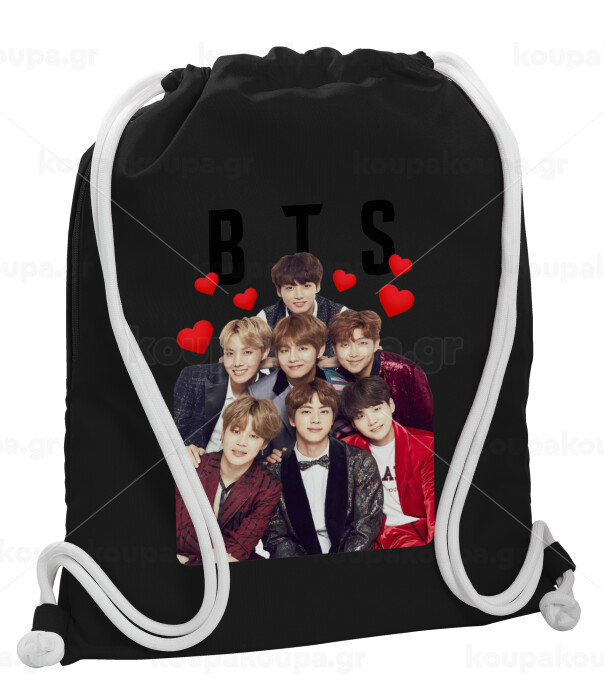 BTS hearts, Backpack pouch GYMBAG Black, with pocket (40x48cm) & thick white cords