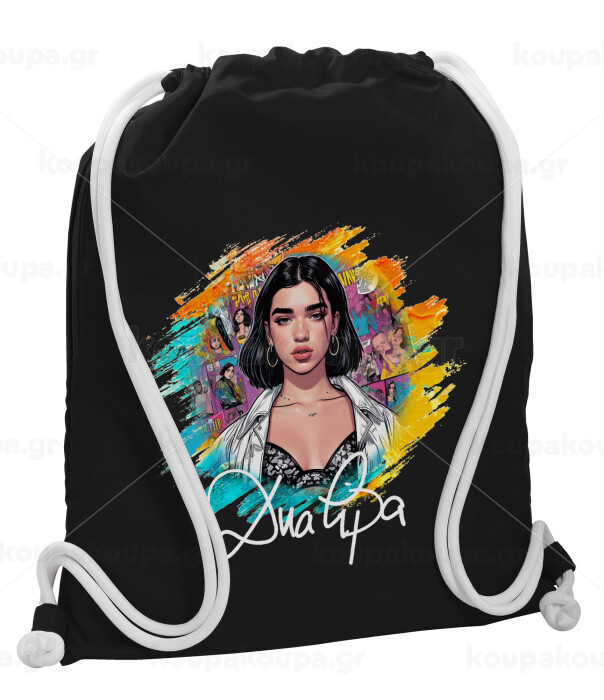 Dua lipa, Backpack pouch GYMBAG Black, with pocket (40x48cm) & thick white cords