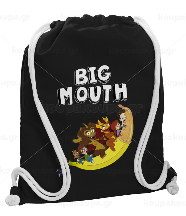 Big mouth, Backpack pouch GYMBAG Black, with pocket (40x48cm) & thick white cords