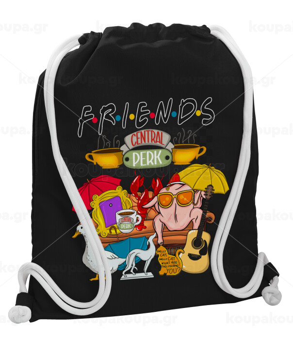 Friends, Backpack pouch GYMBAG Black, with pocket (40x48cm) & thick white cords