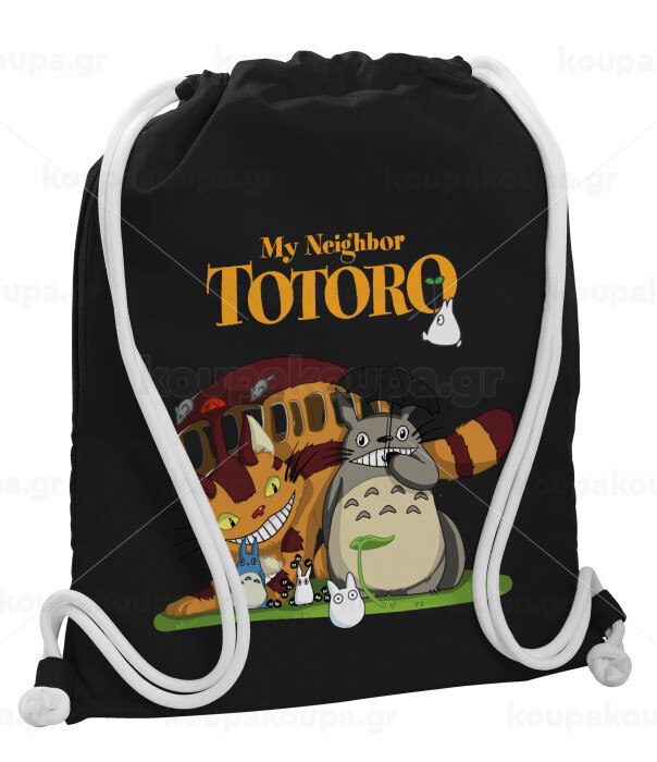 Totoro and Cat, Backpack pouch GYMBAG Black, with pocket (40x48cm) & thick white cords
