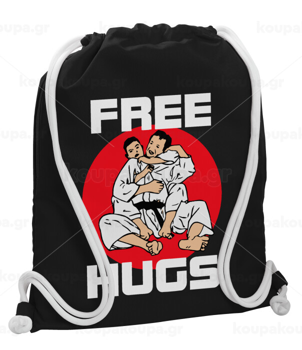 JUDO free hugs, Backpack pouch GYMBAG Black, with pocket (40x48cm) & thick white cords