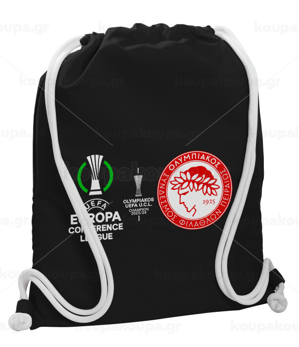 Olympiacos UEFA Europa Conference League Champion 2023/24, Backpack pouch GYMBAG Black, with pocket (40x48cm) & thick white cords