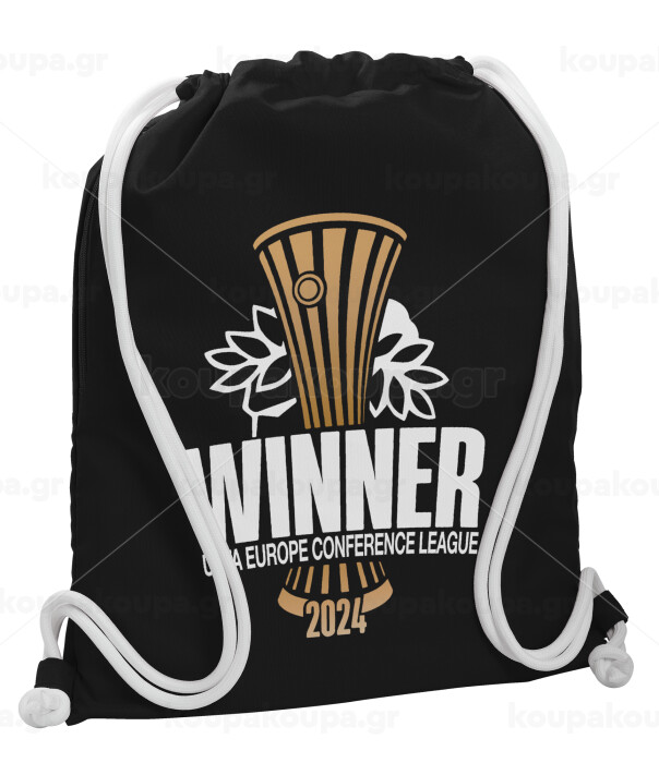 Europa Conference League WINNER, Backpack pouch GYMBAG Black, with pocket (40x48cm) & thick white cords