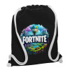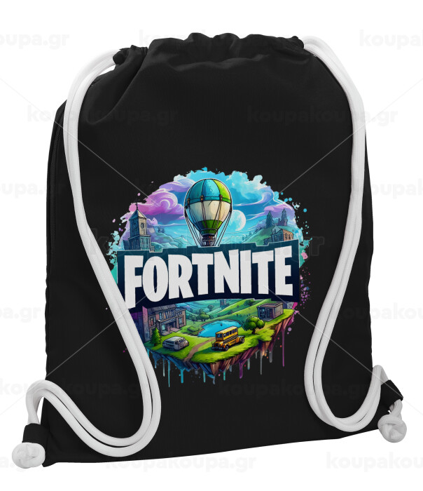 Fortnite land, Backpack pouch GYMBAG Black, with pocket (40x48cm) & thick white cords