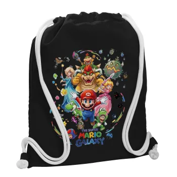 Mario Galaxy, Backpack pouch GYMBAG Black, with pocket (40x48cm) & thick white cords