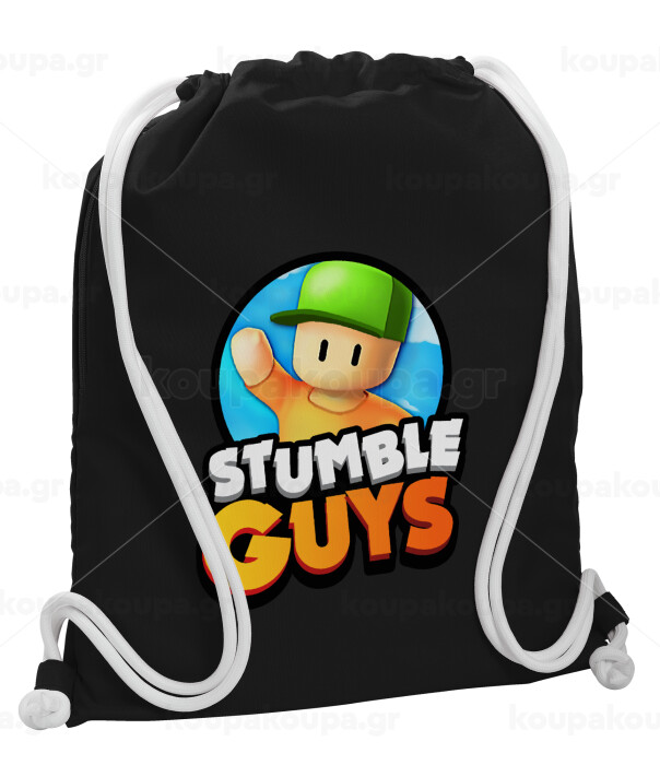 Stumble Guys, Backpack pouch GYMBAG Black, with pocket (40x48cm) & thick white cords