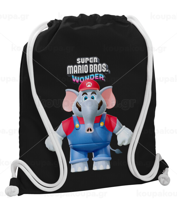 Super mario wonder, Backpack pouch GYMBAG Black, with pocket (40x48cm) & thick white cords