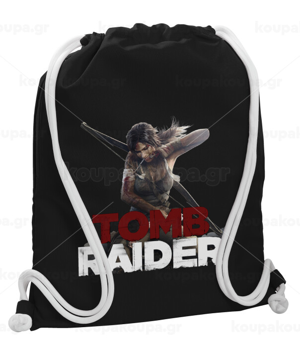 Tomb raider, Backpack pouch GYMBAG Black, with pocket (40x48cm) & thick white cords