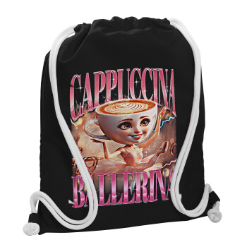 BALLERINA CAPUCHINA FUNK, Backpack pouch GYMBAG Black, with pocket (40x48cm) & thick white cords