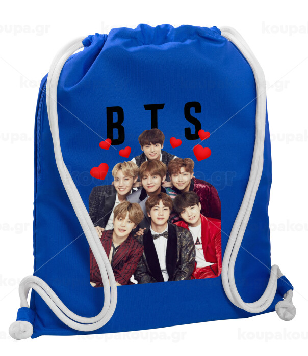BTS hearts, Backpack pouch GYMBAG Blue, with pocket (40x48cm) & thick cords