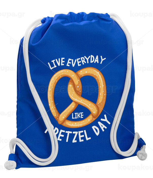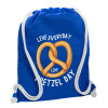 The office, Live every day like pretzel day, Backpack pouch GYMBAG Blue, with pocket (40x48cm) & thick cords
