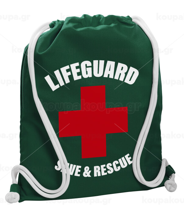 Lifeguard Save & Rescue, Backpack pouch GYMBAG BOTTLE GREEN, with pocket (40x48cm) & thick white cords