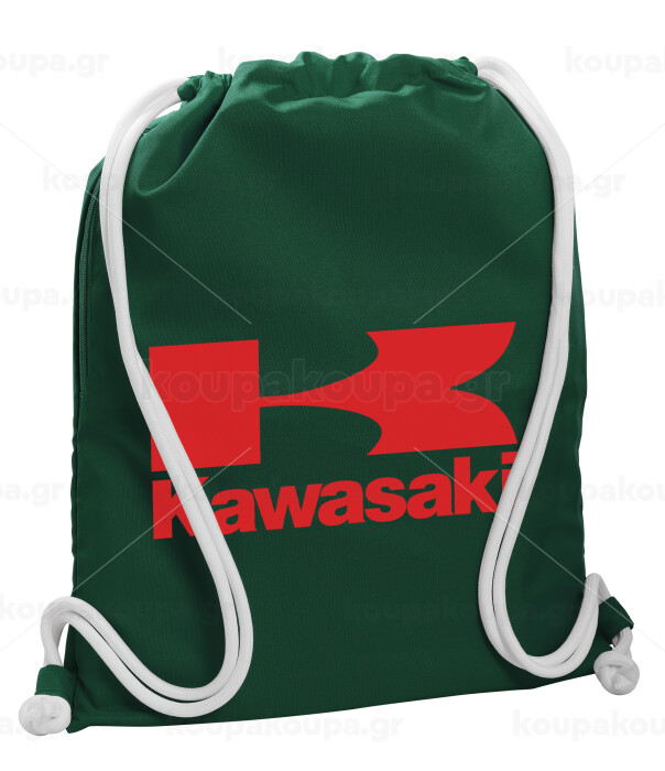 Kawasaki, Backpack pouch GYMBAG BOTTLE GREEN, with pocket (40x48cm) & thick white cords