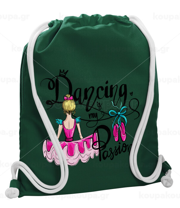 Dancing is my Passion, Backpack pouch GYMBAG BOTTLE GREEN, with pocket (40x48cm) & thick white cords