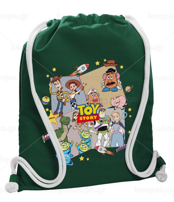 toystory characters, Backpack pouch GYMBAG BOTTLE GREEN, with pocket (40x48cm) & thick white cords