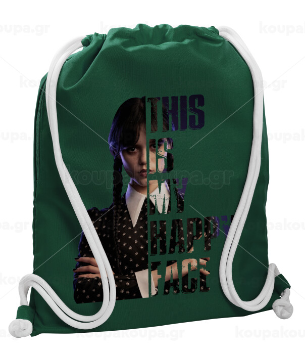 Wednesday, This is my happy face, Backpack pouch GYMBAG BOTTLE GREEN, with pocket (40x48cm) & thick white cords
