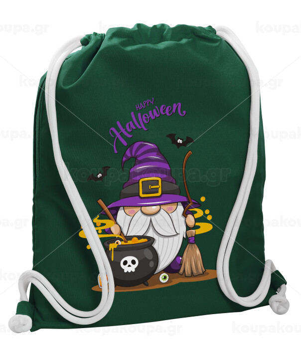 Happy Halloween (Χαλοουίν), Backpack pouch GYMBAG BOTTLE GREEN, with pocket (40x48cm) & thick white cords