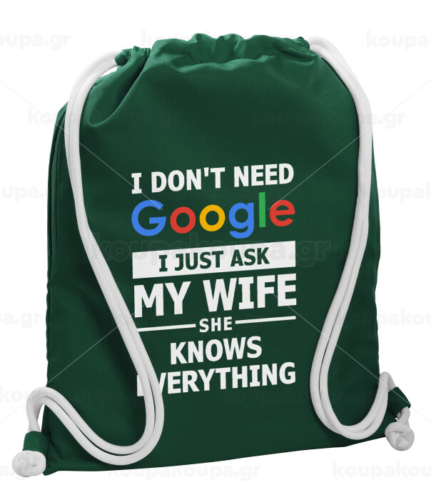 I don't need Google, just ask my WIFE, Backpack pouch GYMBAG BOTTLE GREEN, with pocket (40x48cm) & thick white cords