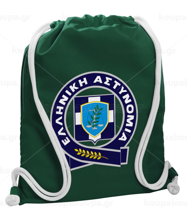 Ελληνική Αστυνομία, Backpack pouch GYMBAG BOTTLE GREEN, with pocket (40x48cm) & thick white cords