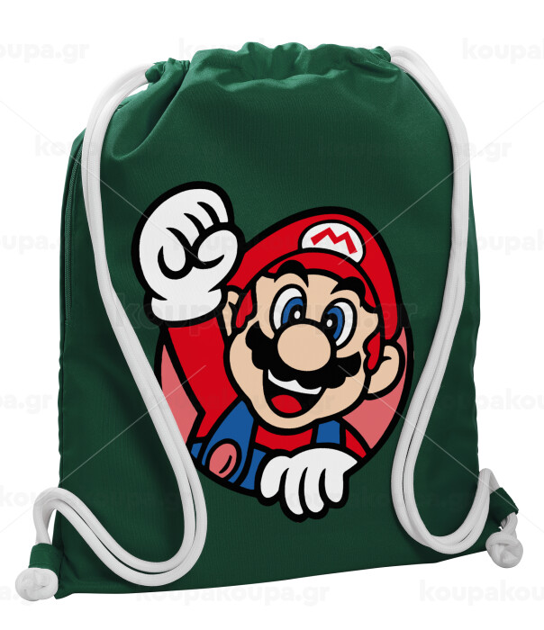Super mario win, Backpack pouch GYMBAG BOTTLE GREEN, with pocket (40x48cm) & thick white cords